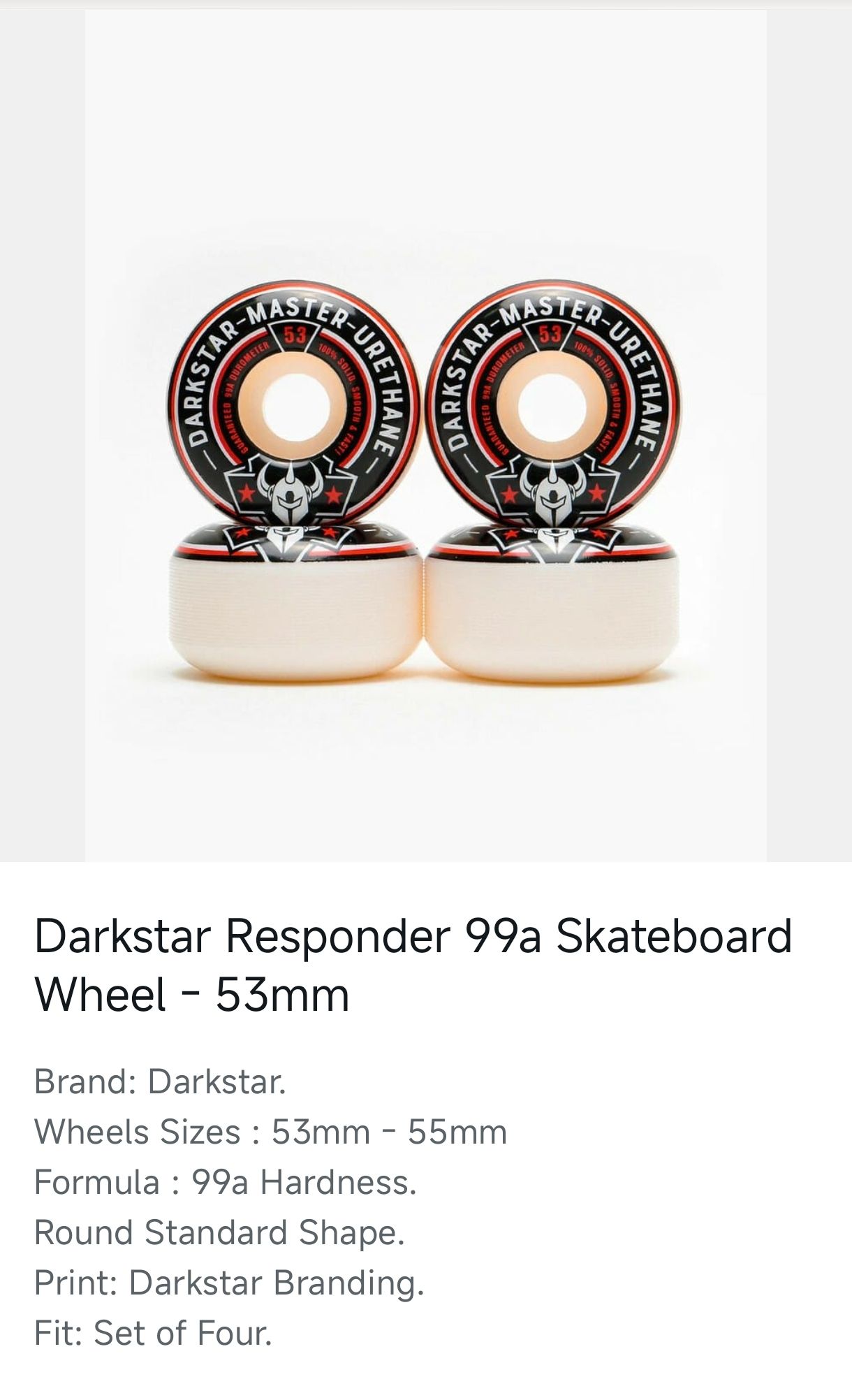 Darkstar Insignia 99a and Darkstar Responder 99a Skateboard Wheel are street and park legends when it comes to smooth rides. Park yourself a pair and get response all day.